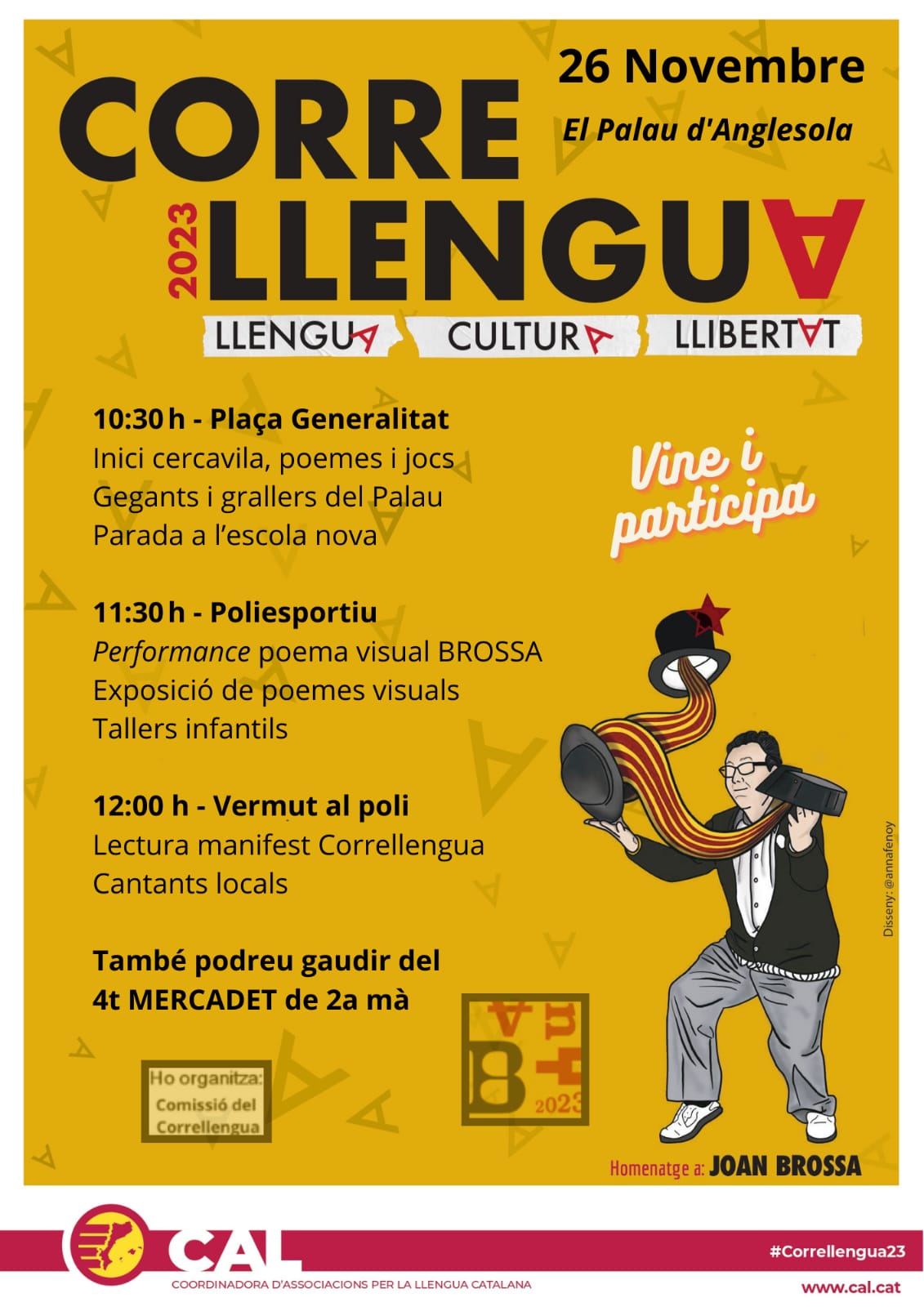 El diumenge 26 de novembre: CORRELLENGUA 2023 al Palau d'AnglesolaTambé 4t Mercadet de 2a màCultura, SocietatDimarts, 21 de novembre de 2023 - 12:09 h El diumenge 26 de novembre: CORRELLENGUA 2023 al Palau d'Anglesola