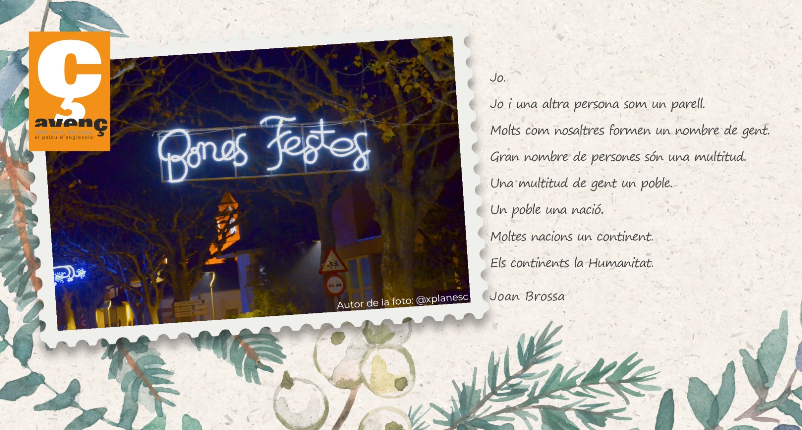 L'equip de l'Avenç del Palau d'Anglesola us desitja BONES FESTES!L'Associació Cultural Tots Som de CasaLleure i festes, EntitatsDilluns, 25 de desembre de 2023 - 23:00 h L'equip de l'Avenç del Palau d'Anglesola us desitja BONES FESTES!