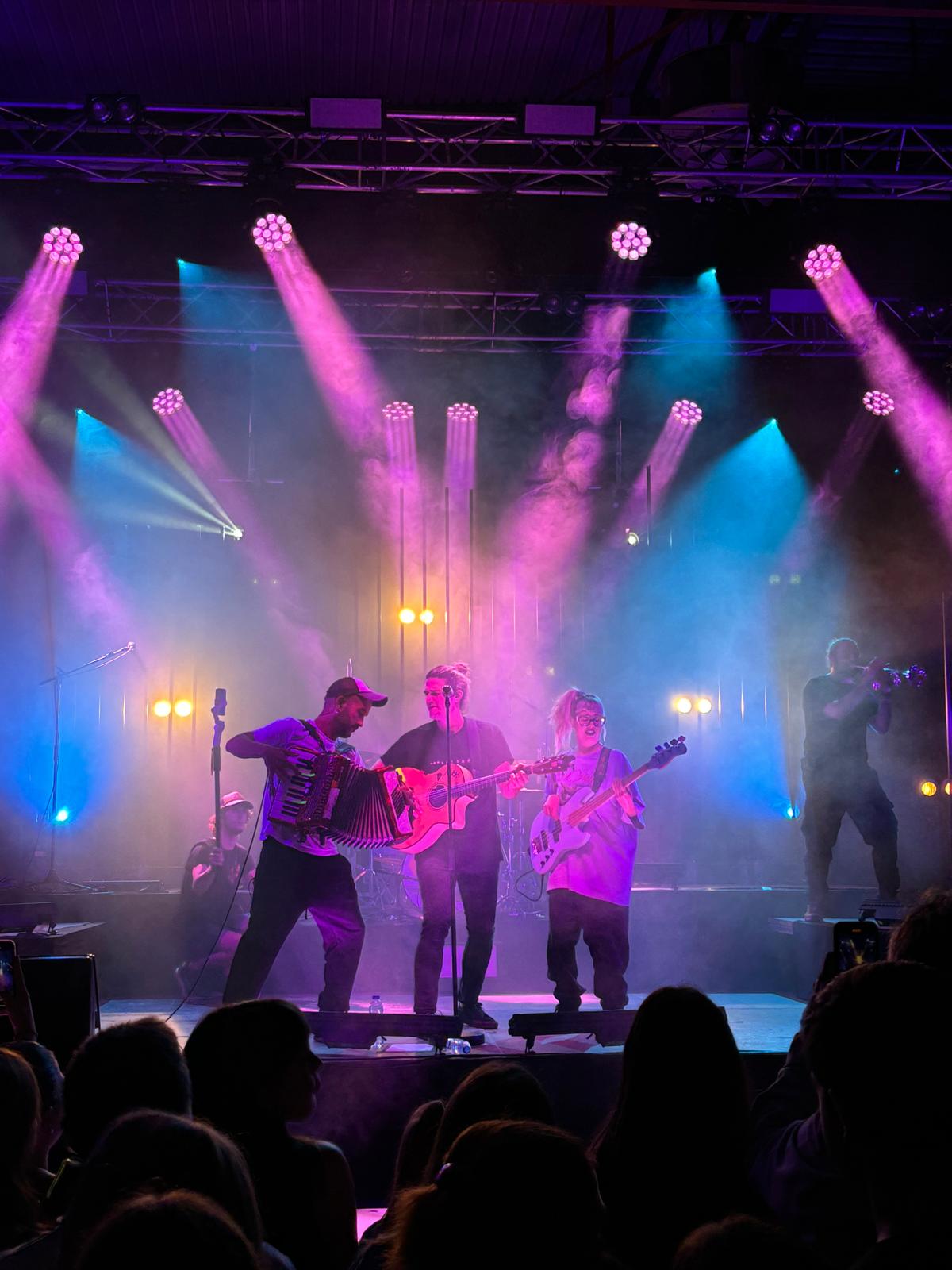 Després de visualitzar el vídeo més viralitzat de la vila plaurgellenca, han entrat al pavelló poliesportiu el Bernat i l'Elisenda, els gegants del Palau d'Anglesola, amb els grallers. Seguidament, entremig del públic, la colla Bastonera del Casal Arreu ha interpretat Som de l'Oest i la Polca d'Ours, per donar pas al manifest del Correllengua 2024, escrit per Jordi Badia, que han llegit els hereus i pubilles del Palau d'Anglesola.