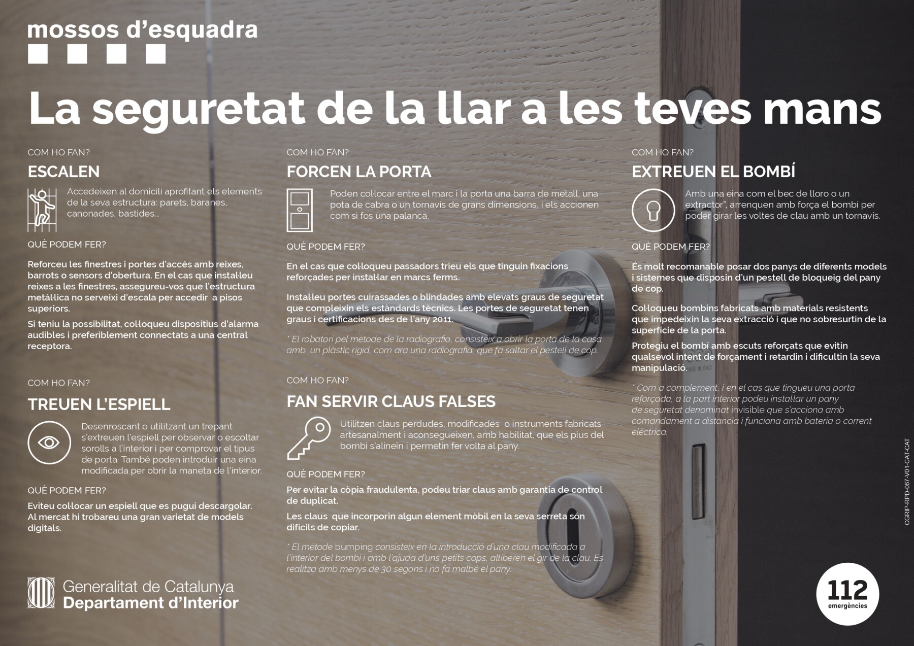 És de vital importància que s’incrementin les mesures de seguretat entre els veïns i que col·laborin trucant al 112 IMMEDIATAMENT en cas que detectin situacions sospitoses o la presència de persones que els generin inseguretat. Cal que la ciutadania s’impliqui en la seva seguretat!