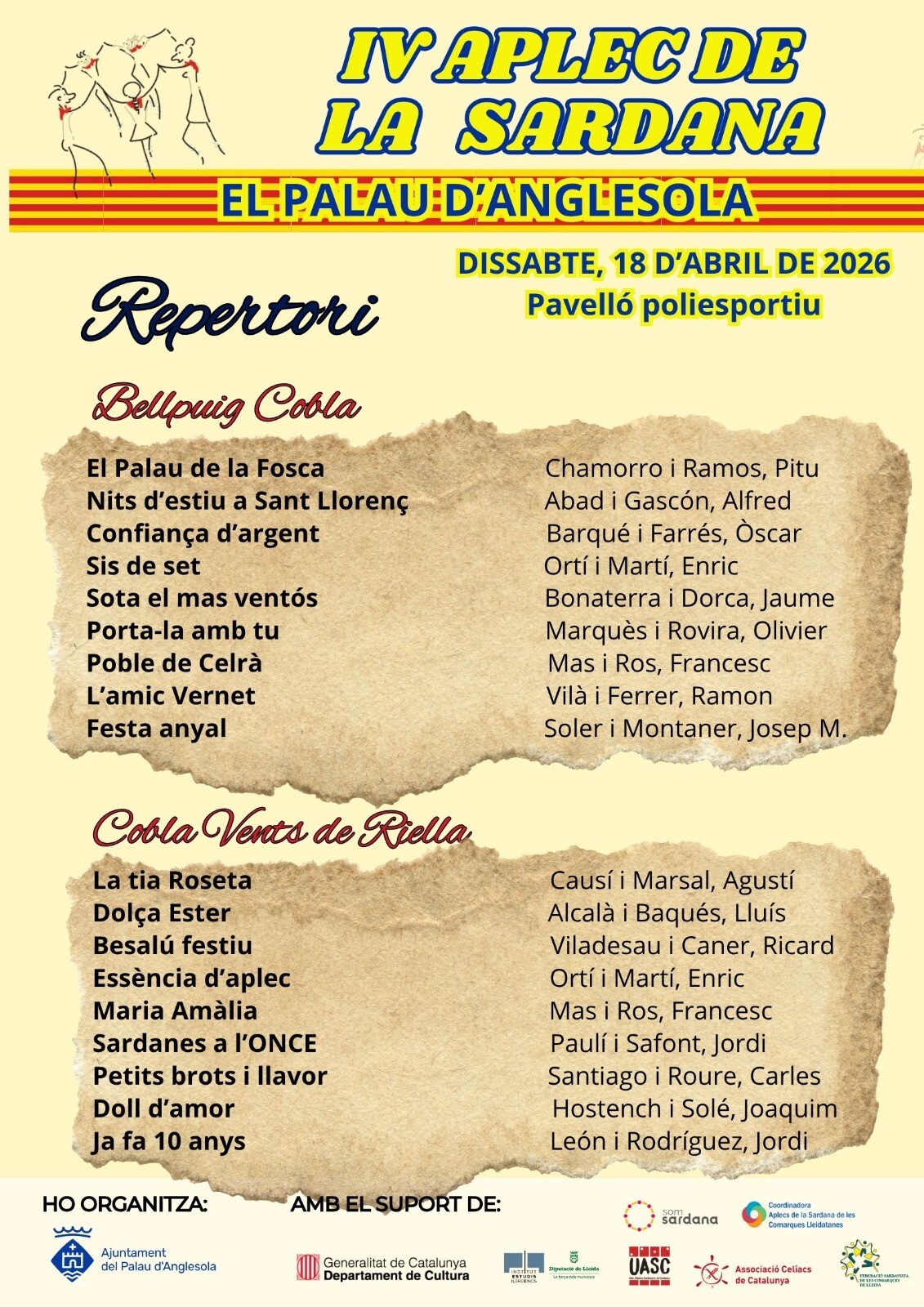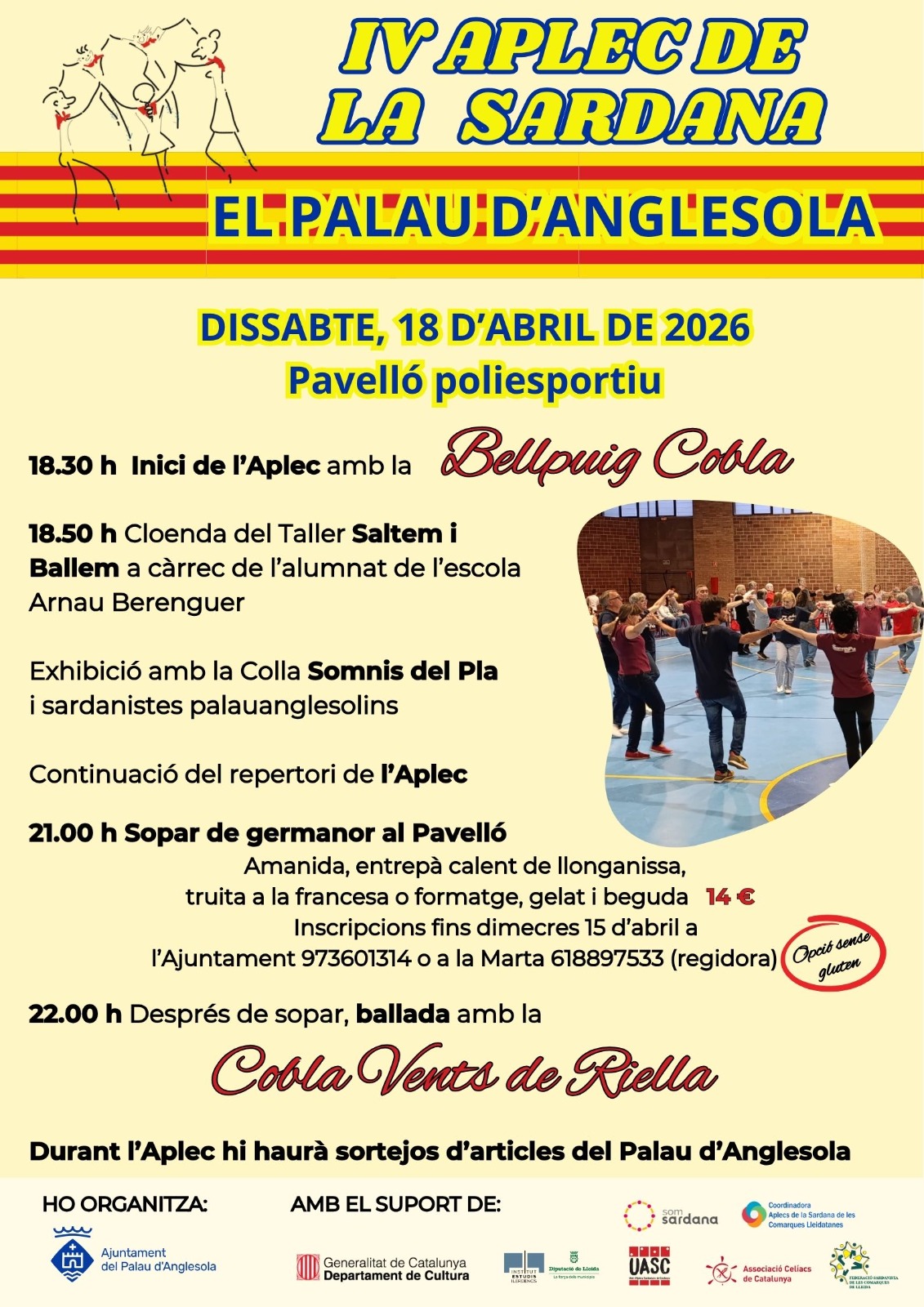 IV Aplec de la Sardana al Palau d'Anglesola el 18 d'abrilAl pavelló poliesportiuCultura, Lleure i festesDimecres, 8 d'abril de 2026 - 23:30 h IV Aplec de la Sardana al Palau d'Anglesola el 18 d'abril